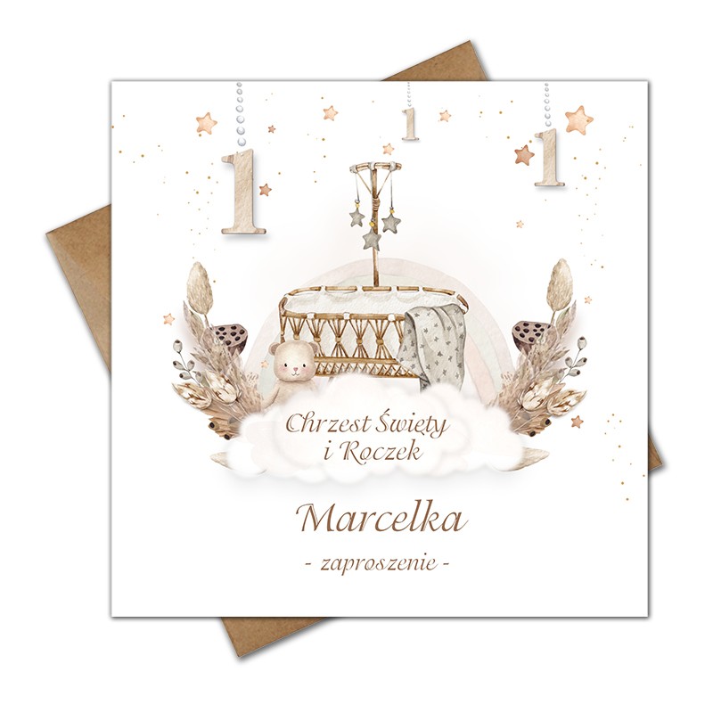 Zaproszenia na chrzest i roczek 2w1 boho kołyska